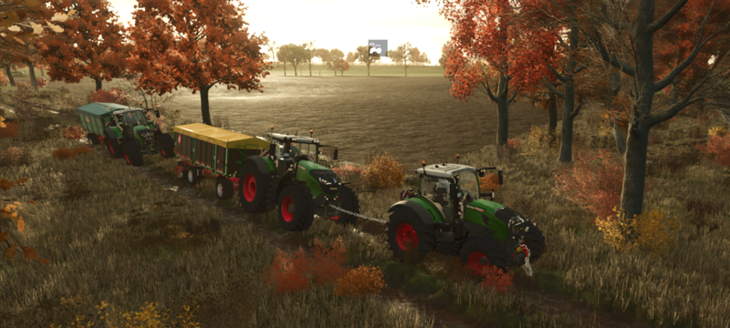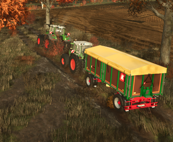 Das geht super fix. Ich habe einen Fendt 936 genommen und vorne den Häcksler dran und hinten einen Dreiachs-Krampeanhänger mit ordentlich Volumen.