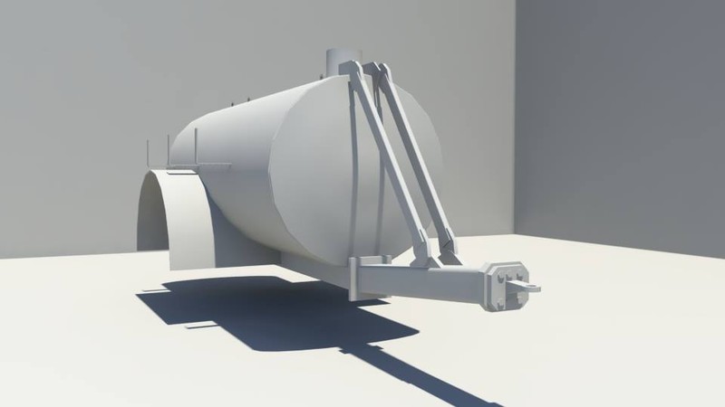 Bisher sieht das ganze schon echt gut aus. Aber was mir so auf den ersten Blick auffällt ist, dass die Deichsel nicht ganz passt. Die echte ist V-förmig und läuft schräg nach oben. Die Kupplung und ein kleiner Teil der Deichsel sind jedoch komplett waagerecht. Die V-Form brauchst du nachher, um den Kompressor unterzubringen. (Ist ja auf dem Bild in einer kleinen "Schale" unter der Deichsel befestigt.) Dann sind beide Deichselhälften an den Seiten über rechtwinklige Metallplatten bis ganz hinten am Fass befestigt und nicht wie im Render in der Mitte. Versteh mich bitte nicht falsch, die Form in der du die Deichsel gemacht hast, sieht wirklich gut aus, nur müsste man sich dann eine andere Lösung für den Kompressor und die seitlich hinter den Metallverkleidungen verlegten Kabel überlegen.
