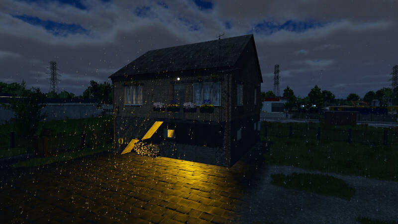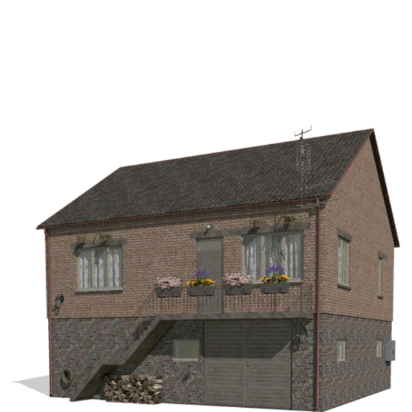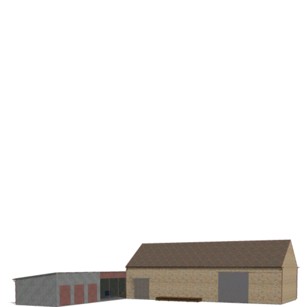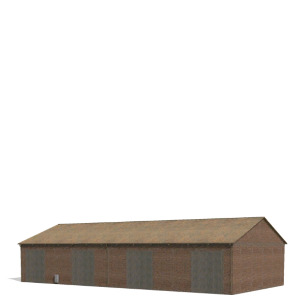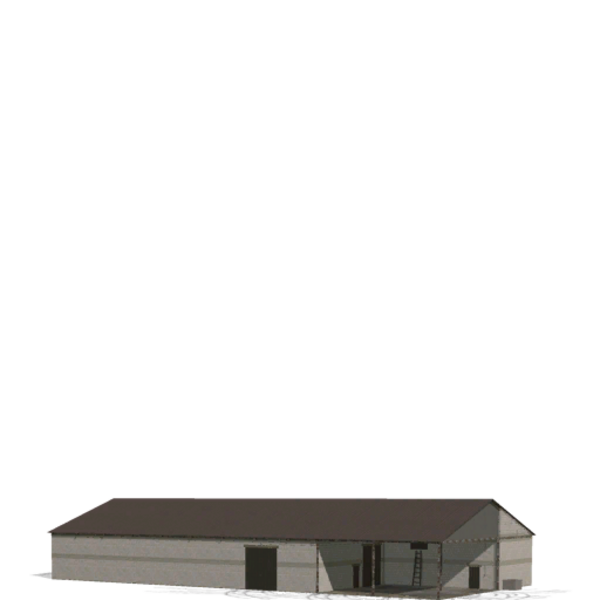 Kuhstall: Bietet Platz für bis zu 100 Kühe, enthält einen kleinen Raum mit Milchtanks und eine Küche.