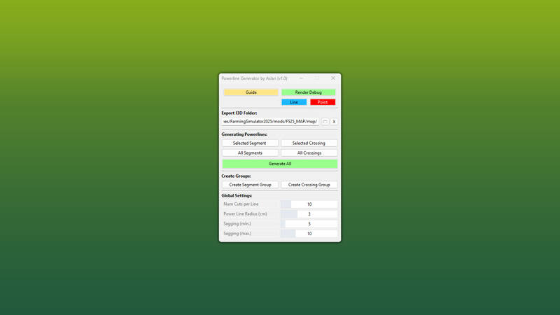 Die generierten Stromleitungen entsprechen dem offiziellen LS25-Standard, einschließlich Windreaktion, und gewährleisten eine realistische Bewegung im Spiel sowie nahtlose Integration in bestehende Karten.