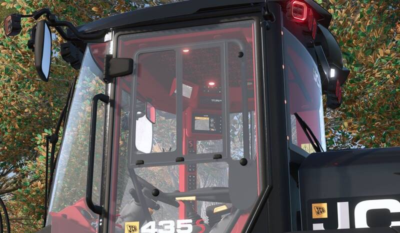 Der JCB 435S ist mit einer großen Anzahl von Rundumleuchten und über 20 Stroboskopleuchten ausgestattet. Er verfügt über zahlreiche Zusatzlichter und LED-Rampen, Positionslampen rundum und ein neues rotes Interieur mit optionaler roter Beleuchtung. Im Fahrerhaus befinden sich ein Michelin-Männchen, ein LGF-Schild und eine Rückfahrkamera (MB DLC erforderlich). Benötigtes Mod: Interactive Control.