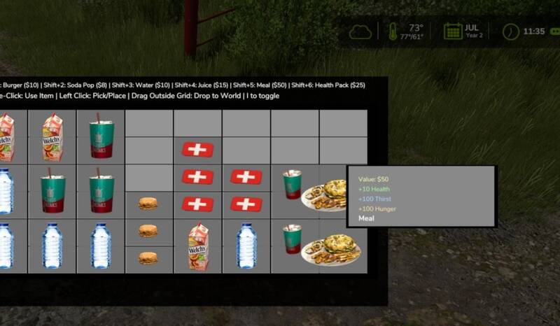 Dieser Mod bringt ein Survival-System mit Hunger-, Durst- und Gesundheitsmechaniken ins Spiel. Verwalte deine Bedürfnisse über ein intuitives Inventarsystem und interagiere direkt mit konsumierbaren Gegenständen in der Spielwelt.