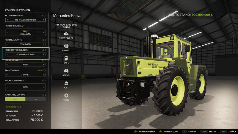 Dieses Skript ermöglicht es Ihnen, einen alternativen Motorensound für viele Fahrzeuge zu konfigurieren. Mit der neuen „Mehr Motorengeräusche“-Konfiguration im Shop können Sie verschiedene Sounds aus einer großen Datenbank auswählen. Die verfügbaren Sounds variieren je nach Fahrzeugmodell und umfassen verschiedene Motorengeräusche für 4-, 6- und 8-Zylinder-Motoren. Einige Sounds bieten auch Varianten, zum Beispiel mit integriertem Turbo, einem Blow-off-Ventil oder einer Open-Pipe-Option. Bitte beachten Sie: Blow-off-Sounds können nur im Einzelspielermodus ausgewählt werden!