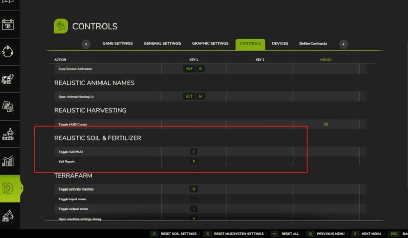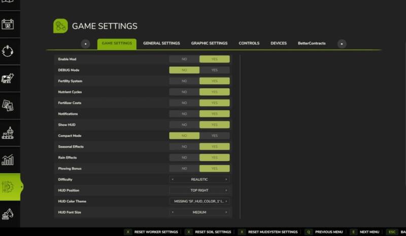 Alle Einstellungen sind im Spiel unter Boden & Dünger zugänglich. Im Mehrspielermodus werden die Spiel-Einstellungen vom Administrator kontrolliert, während HUD-/Anzeigeeinstellungen pro Spieler sind.