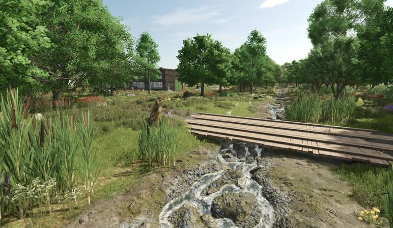 - Neuer malerischer Wald mit einem Bach und breiteren Straßen.