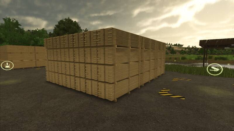 Dieses platzierbare Lager ermöglicht es dir, deine Sägewerksproduktion ordentlich zu lagern und zu organisieren – inklusive Paletten mit Brettern, Planken und Holzbalken. Zur Verschönerung wurden dekorative Paletten hinzugefügt.